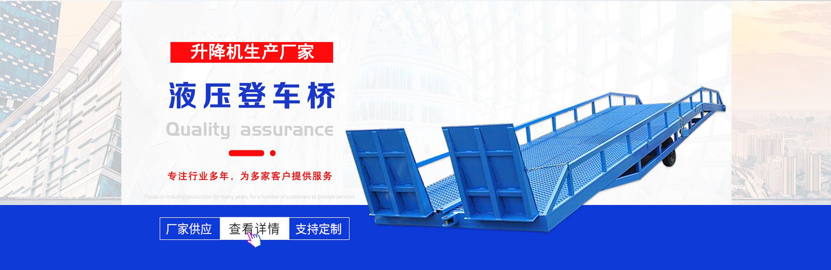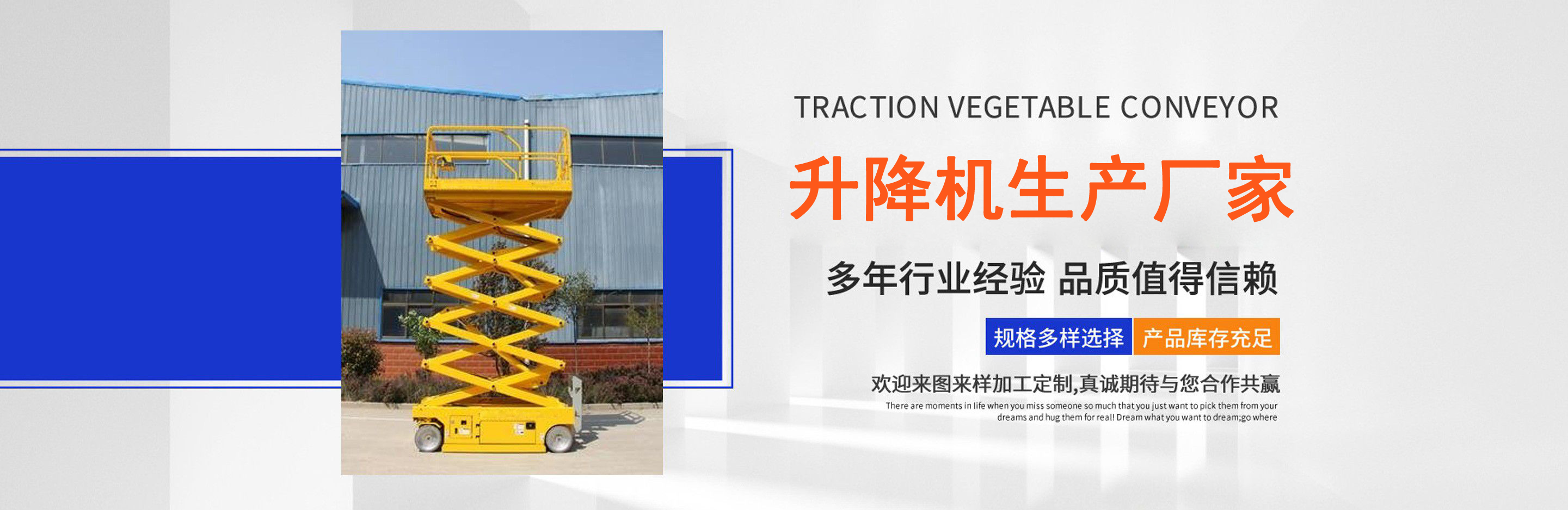 升降機(jī)生產(chǎn)廠家是專業(yè)從事升降平臺(tái),液壓貨梯,卸豬臺(tái),平板拖車,液壓提升機(jī),移動(dòng)式升降機(jī),升降平臺(tái)車,高空作業(yè)設(shè)備,貨梯廠家,液壓登車橋等升降機(jī)械產(chǎn)品制造十余年,服務(wù)過(guò)各大國(guó)內(nèi)外企業(yè)。 自公司創(chuàng)立以來(lái),經(jīng)過(guò)長(zhǎng)期對(duì)液壓升降臺(tái)的研制和探索,積累了豐富的專業(yè)制造技術(shù)和寶貴經(jīng)驗(yàn)。憑借豐富的專業(yè)技術(shù)及不斷開(kāi)拓創(chuàng)新的精神,現(xiàn)已成為專業(yè)于升降機(jī)械的公司。 長(zhǎng)期以來(lái),憑借公司不斷的壯大及對(duì)液壓技術(shù)的不斷改進(jìn)和探索。能根據(jù)客戶不同的要求設(shè)計(jì)一套合理、完善的方案供客戶參考。現(xiàn)有產(chǎn)品:升降平臺(tái),液壓貨梯,卸豬臺(tái),平板拖車,液壓提升機(jī),移動(dòng)式升降機(jī),升降平臺(tái)車,高空作業(yè)設(shè)備,貨梯廠家,液壓登車橋等。本產(chǎn)品在各類工礦企業(yè)、港口物流以及其它領(lǐng)域均發(fā)揮著重要的作用。始終以“以信譽(yù)求生存、以技術(shù)求發(fā)展”為本廠的經(jīng)營(yíng)理念。只要你選購(gòu)我廠的產(chǎn)品,無(wú)論你身在何方都能得到我們迅捷優(yōu)良的服務(wù)。 公司自成立已經(jīng)來(lái)本著"團(tuán)結(jié)、求實(shí)、創(chuàng)新、互贏"的理念,以先進(jìn)的技術(shù)和服務(wù),為客戶建造滿意的產(chǎn)品。幾年來(lái)受到廣大客戶的好評(píng)。...